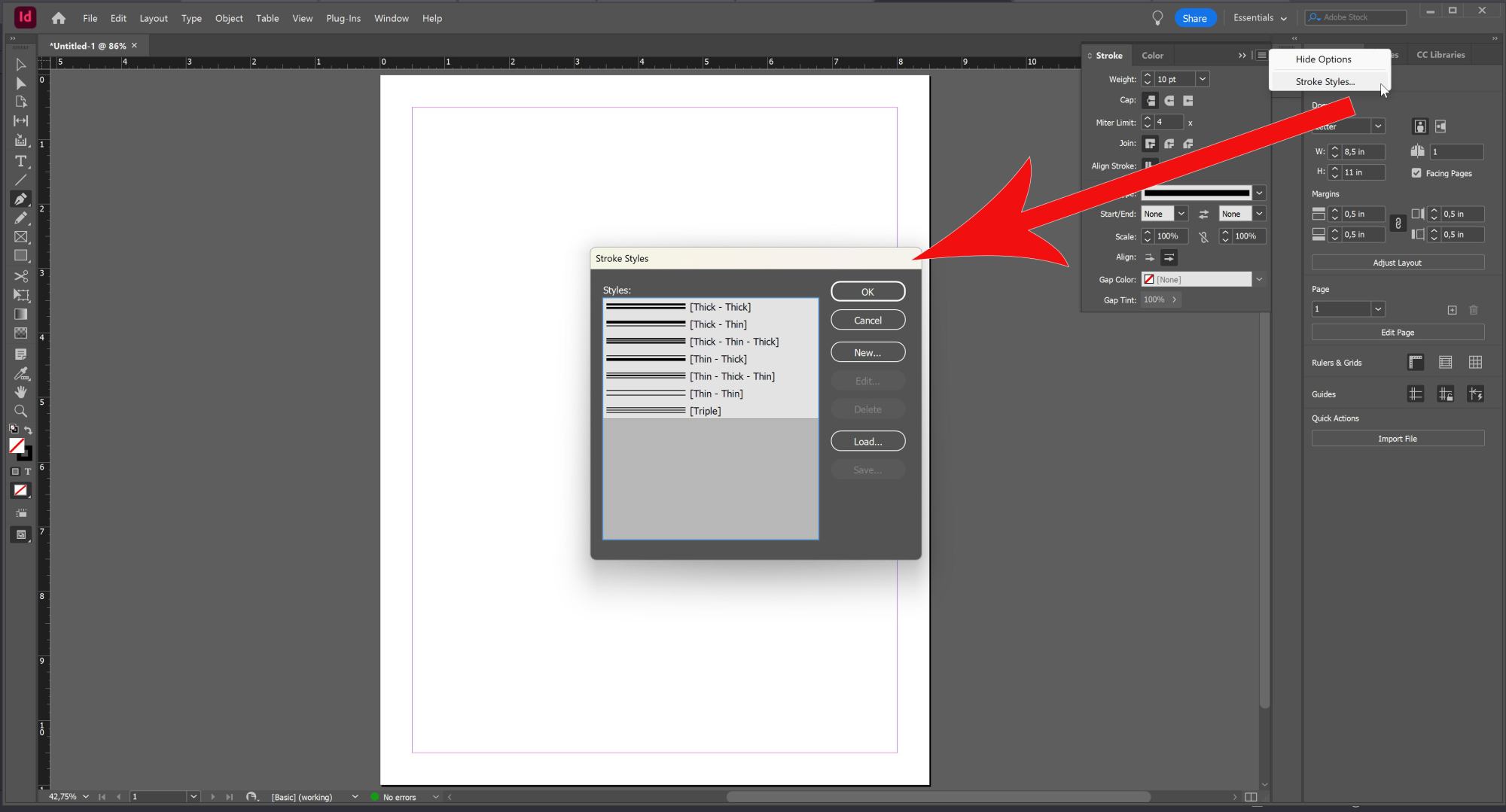 Create cool new stroke styles in InDesign. To do this, open the Stoke Styles Panel by clicking on Window in the top menu bar and then click on Stroke or press F10.