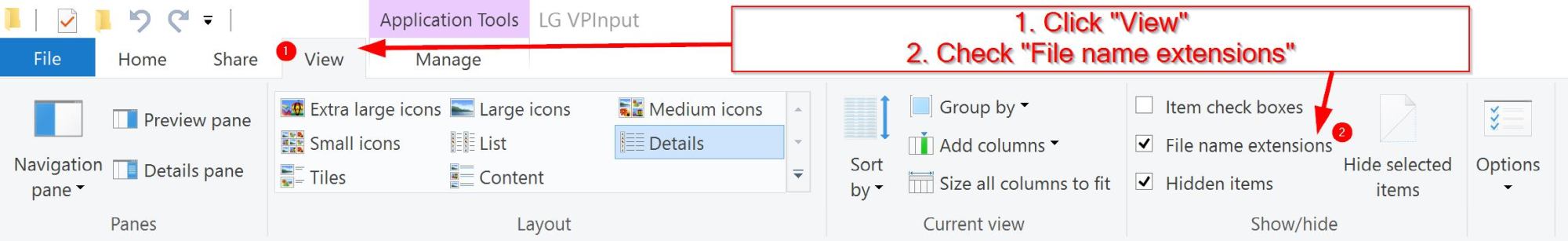 To show file extensions is very easy in Windows 10. Click the view tab and check “File name extension” box.