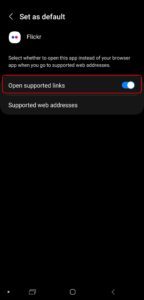 - Congratulation. You are all set. Links will now open in your browser on your phone rather than opening the Flickr Android app. You can still use the app as you have done before. Nothing will change how the app behaves. This only deactivated opening links in emails, messengers like WhatsApp and so on from opening the Flickr app.