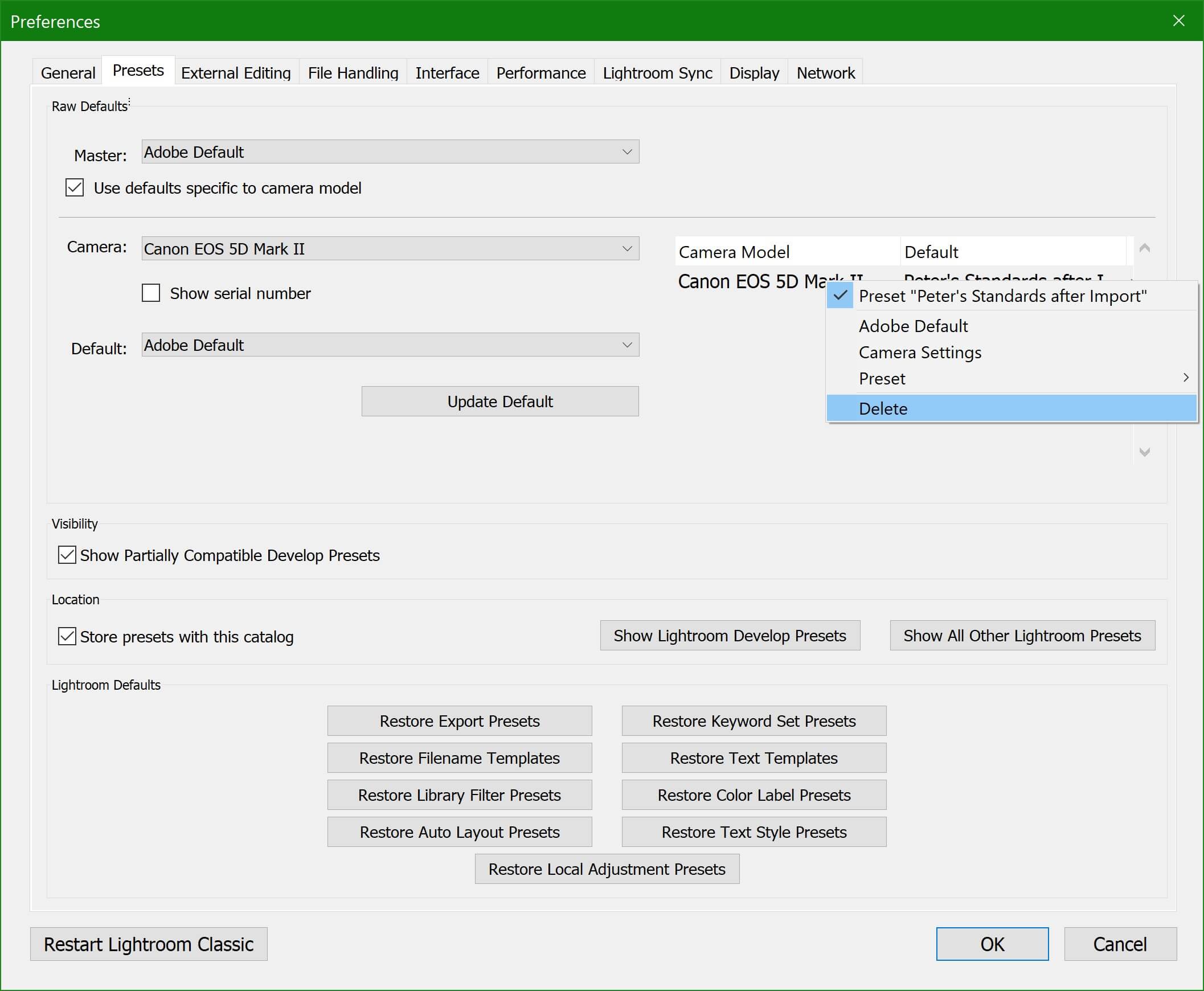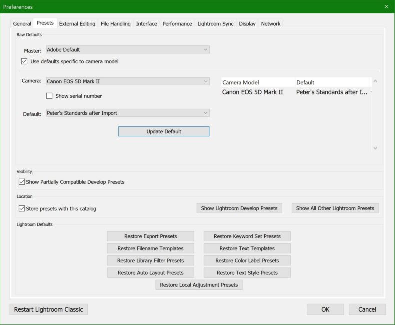There are two ways to use the Raw Defaults in Lightroom. Either you use a “Master” preset or a preset “specific to a camera model”. I would highly recommend you to use the camera model-specific preset, more about it later. To apply a preset specific to a camera model you need at least Adobe Lightroom Classic 9.2.