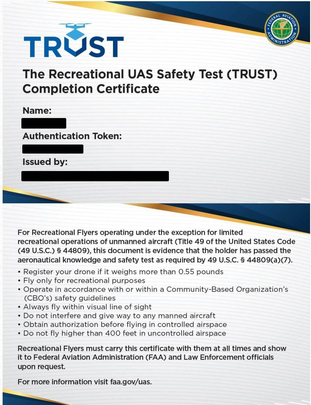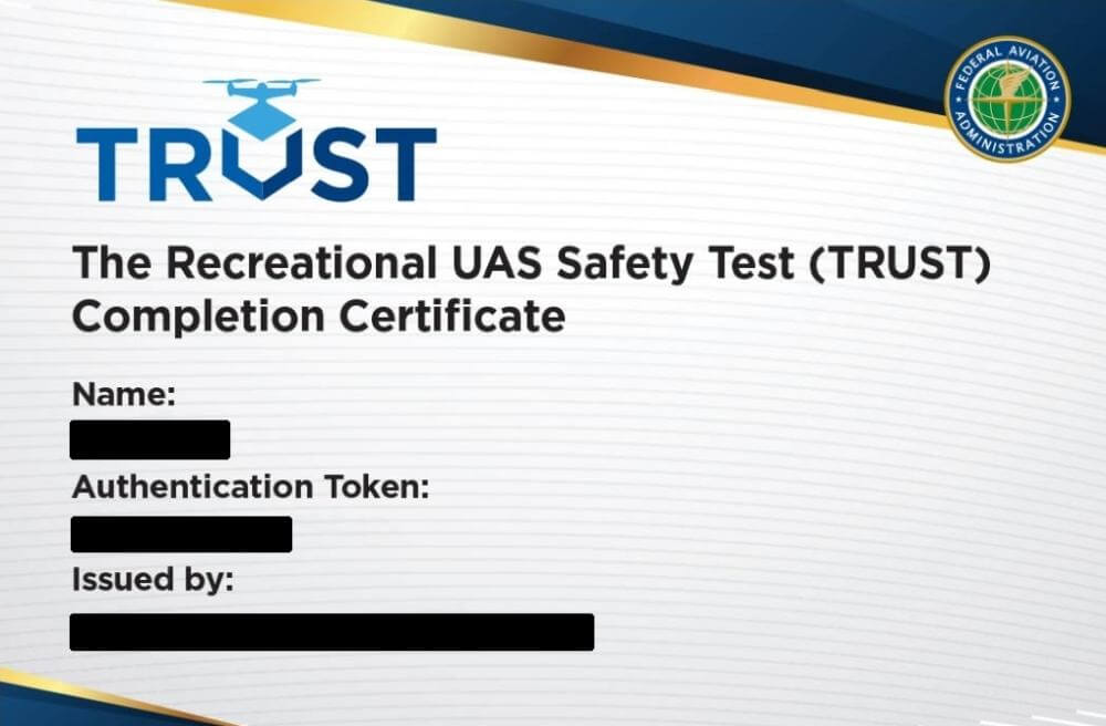 Upon completion, you will be provided with a TRUST completion certificate. Save a copy of it, preferably in the cloud, and have one printed with you whenever you fly. You are required to show this certificate to the FAA or law enforcement if asked. In case you lose your certificate, you will have to re-take the test as neither the FAA nor the test administrators will maintain any personally identifiable information about the recreational drone operator.